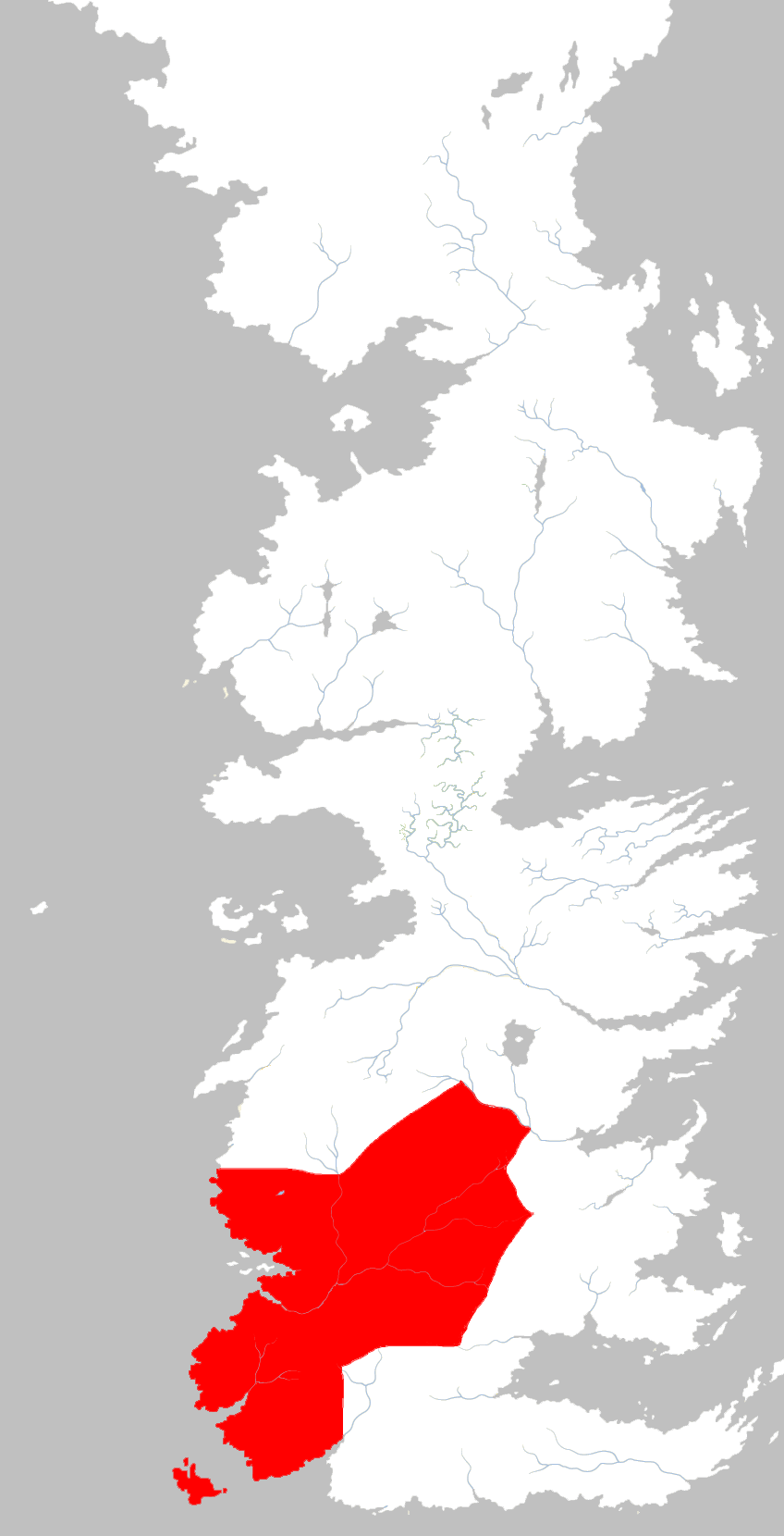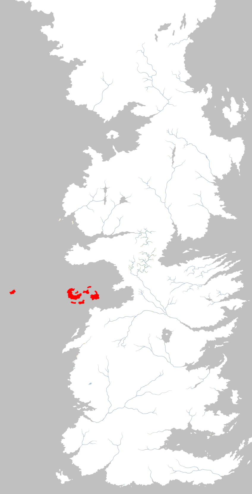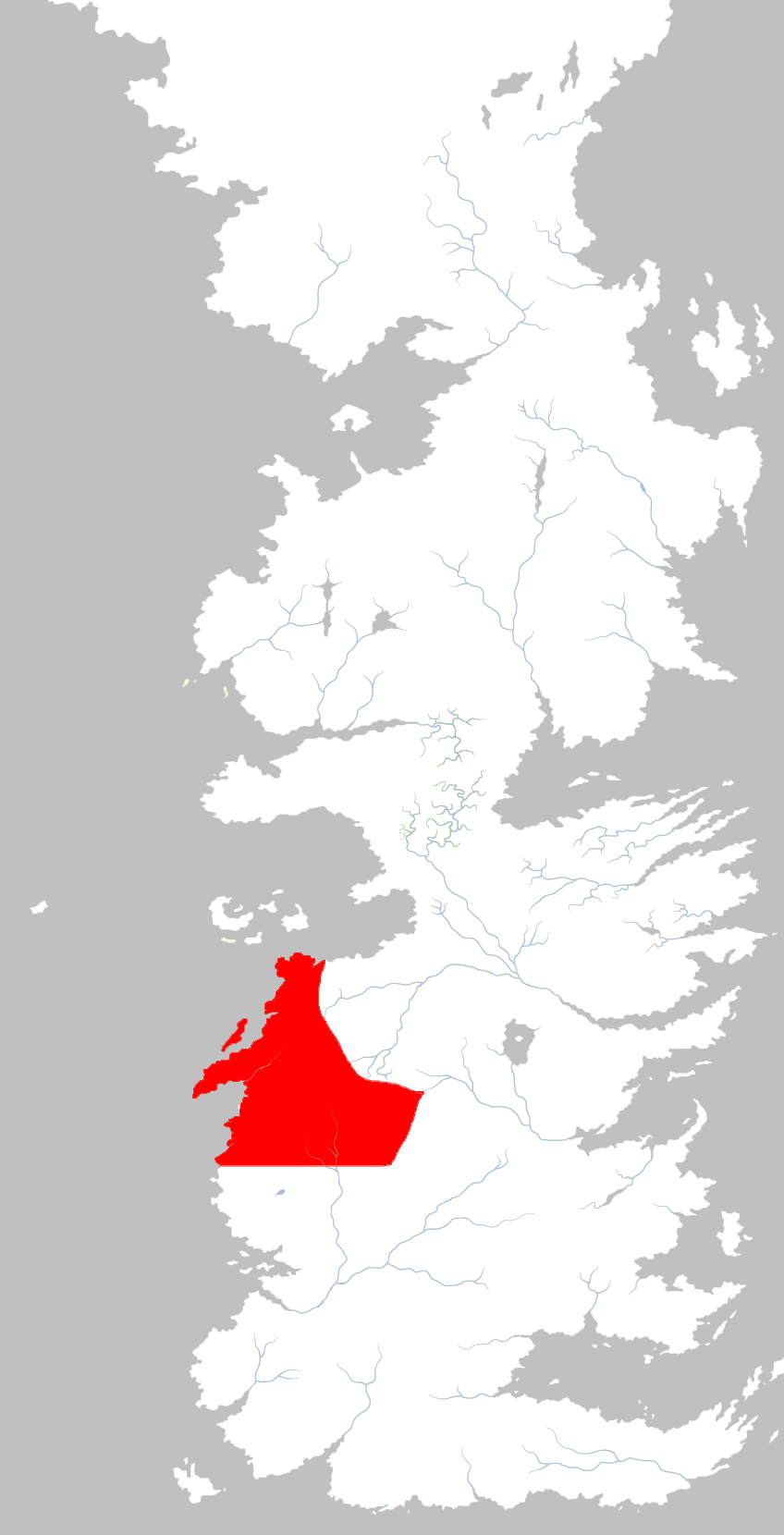 - El Reino de la Roca, gobernado desde Roca Casterlypor un Rey de la Roca de la Casa Lannister.